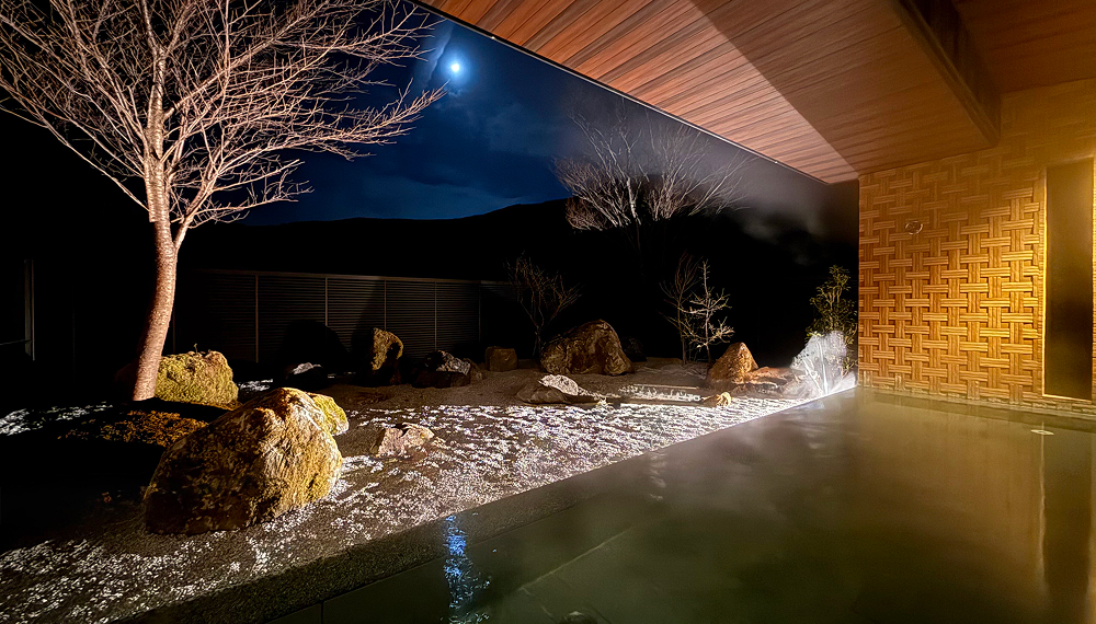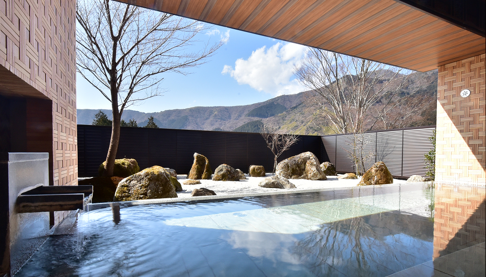 雄大な箱根外輪山を眺めながら、ゆったりと露天風呂はいかがでしょうか。箱根寄木細工をモチーフとした特徴的な壁面が目を楽しませ、非日常なひとときを味わえます。温泉は箱根十七湯のひとつ、「姥子温泉」を源泉としており、肌触りがやわらかく、日々の疲れを癒やしてくれる安らぎの時間を堪能してみては。