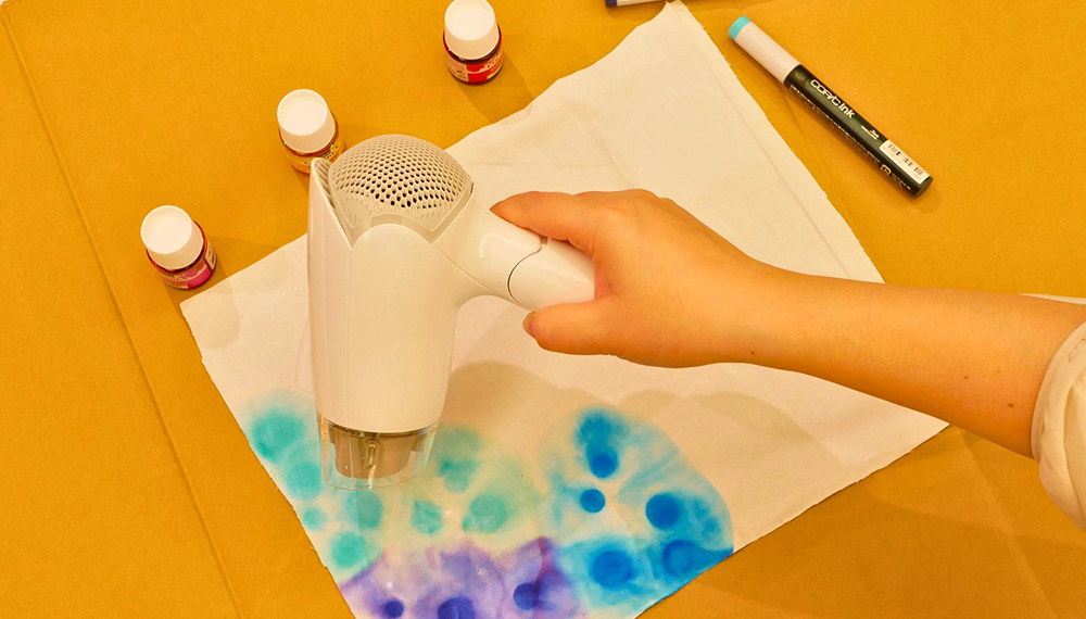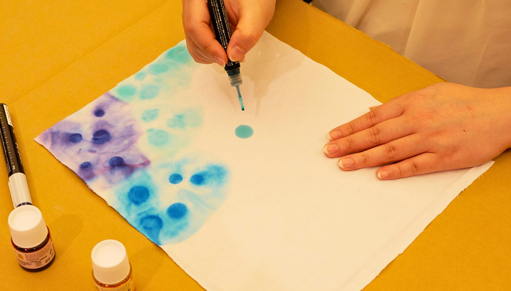 客室で使われなくなったシーツを土台にした無地のうちわに、アルコールインクがじんわりとにじみ、色が溶け合う。偶然の重なりが織りなす唯一無二の模様を楽しみながら、あなただけのオリジナルECOうちわを作りませんか?