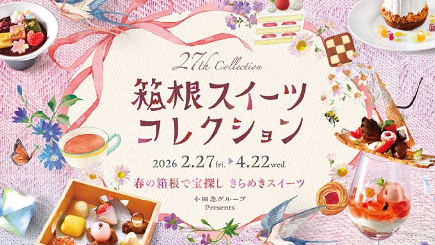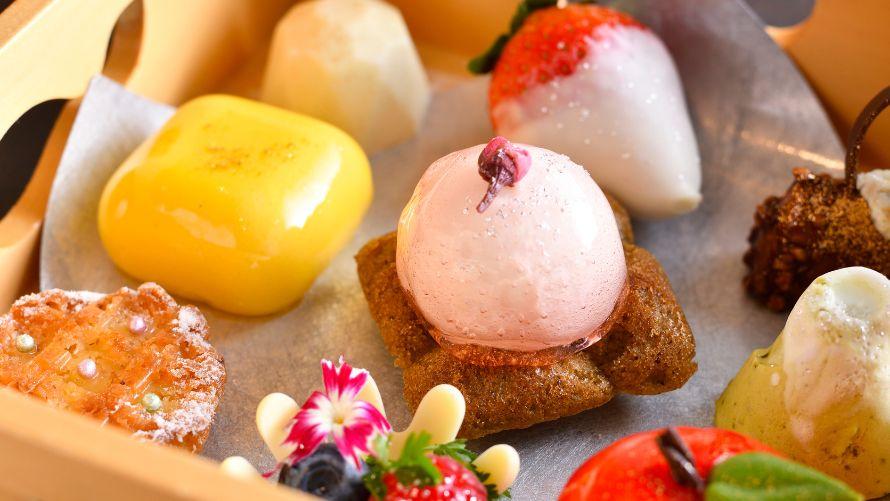 中身がうっすらと透ける宝箱を開けると、きらめくスイーツが・・・。桜のムースや苺のホワイトチョコ、湘南ゴールドムース、箱根山麓紅茶フィナンシェなど、春の訪れと地産の魅力がいっぱいのスイーツで、春の箱根旅を表現しました。コーヒーや紅茶などのお好きなドリンクとともにお楽しみいただけるフリードリンク付きです。