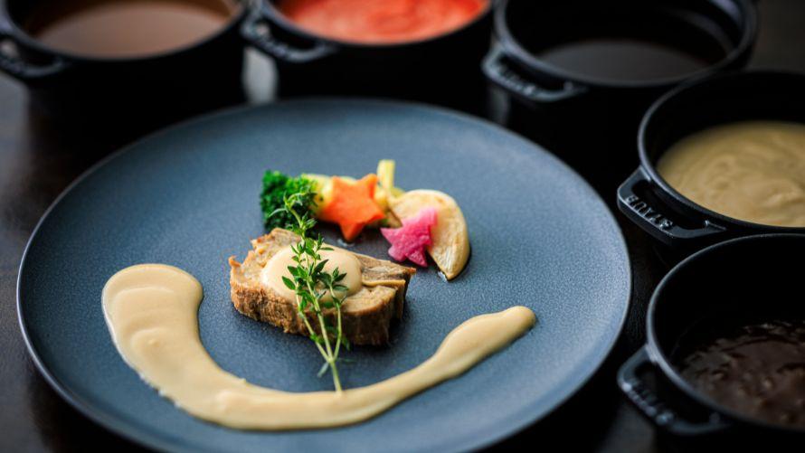 ・きのこのポタージュ または きのこと野菜のブイヨンスープ (べジタリアン対応メニュー)