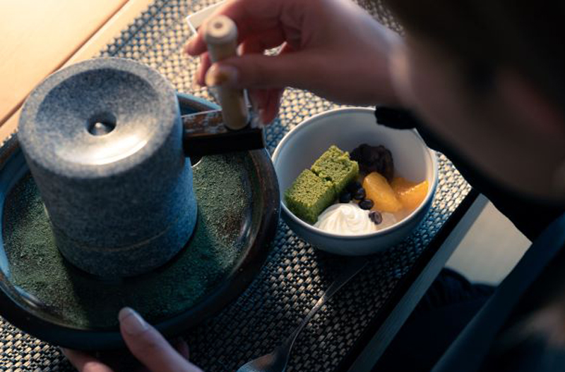 職人がひとつひとつ丁寧に仕上げた香川県産の石臼で碾茶を挽き、出来上がった抹茶粉をお好みでかけて花香路オリジナルの抹茶スイーツをお召しあがりいただけます。
