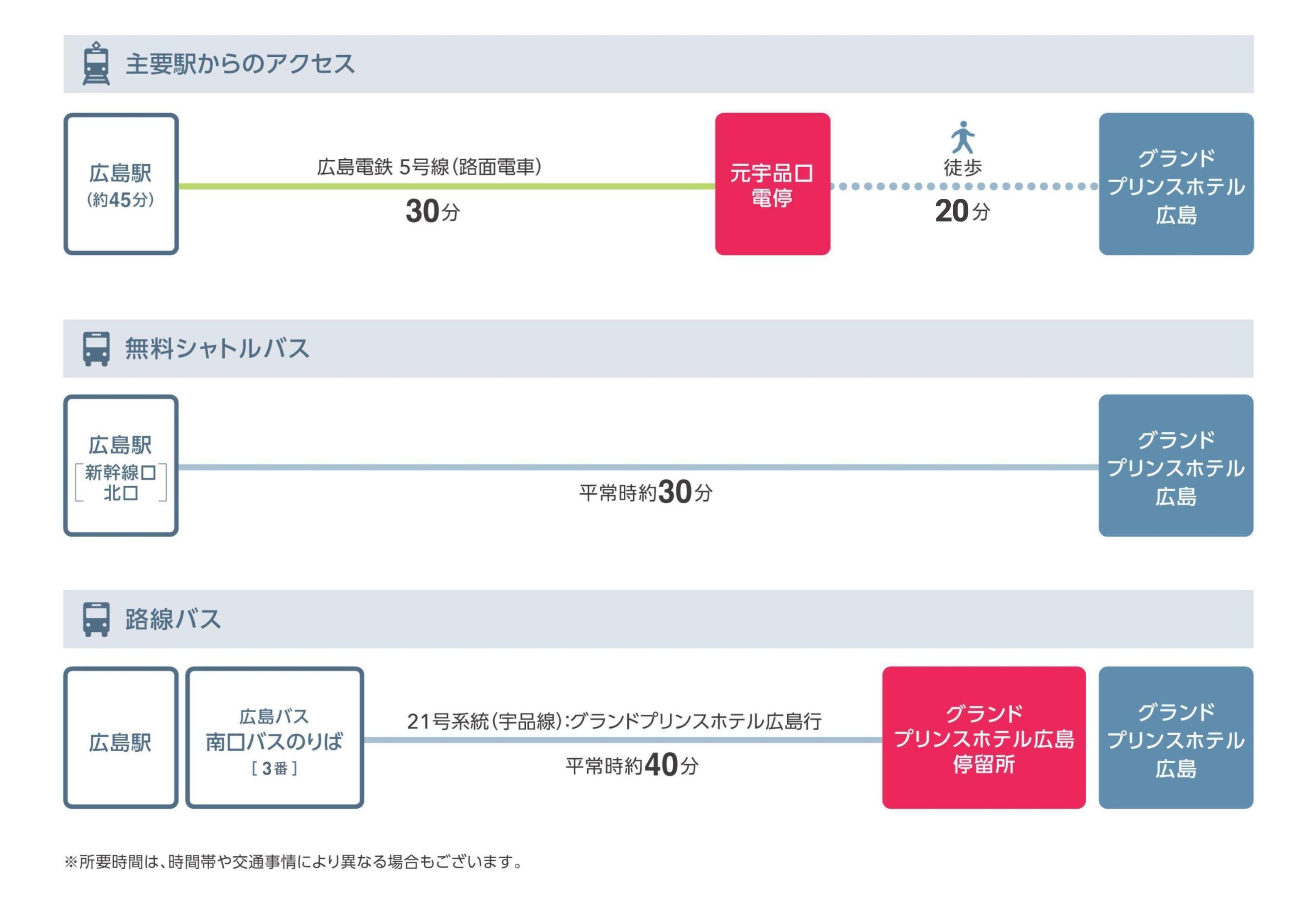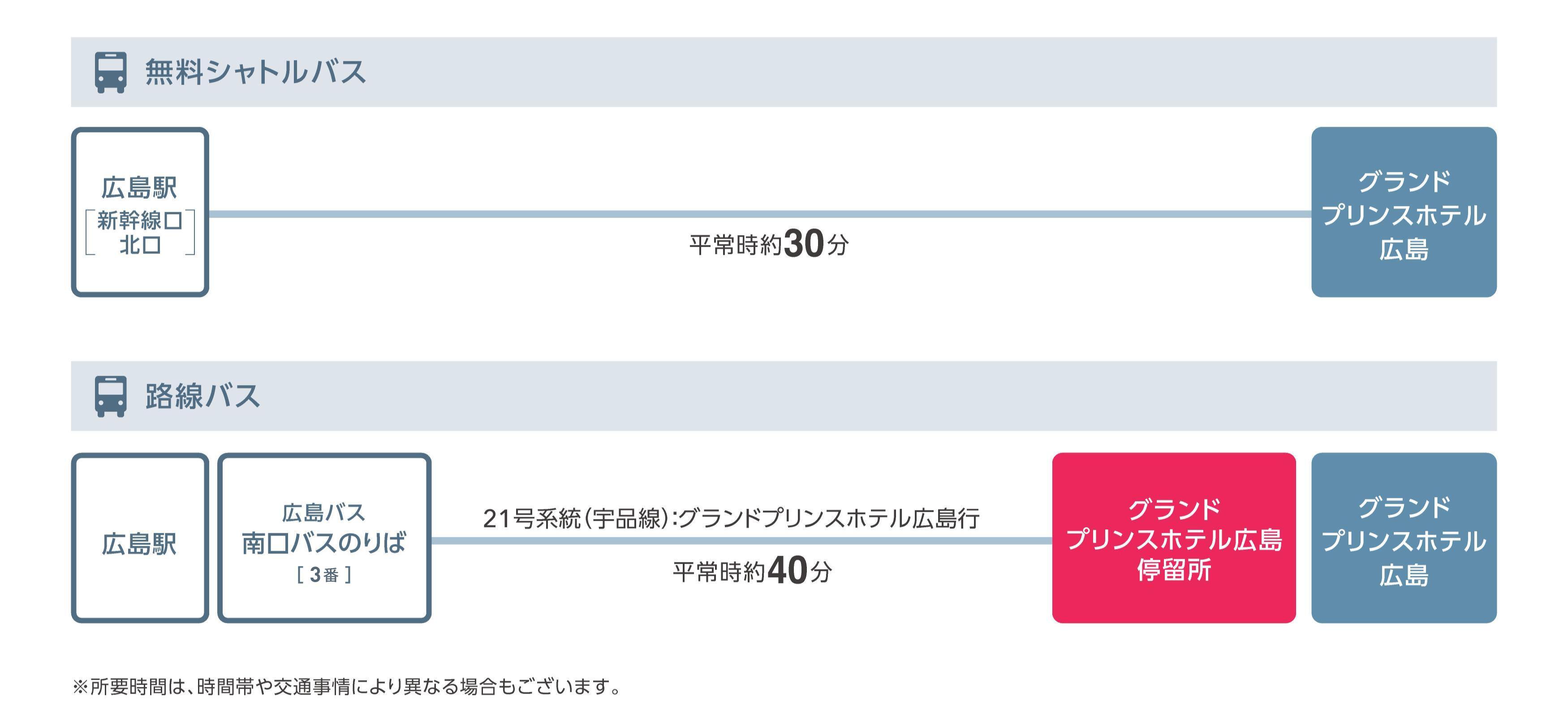 広島駅からは無料シャトルバスまたは路線バスをご利用ください。