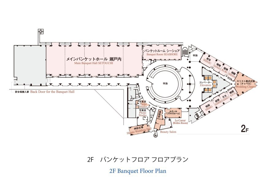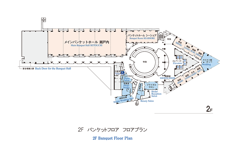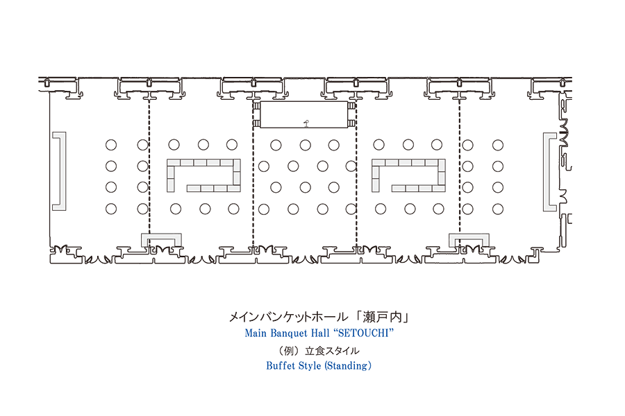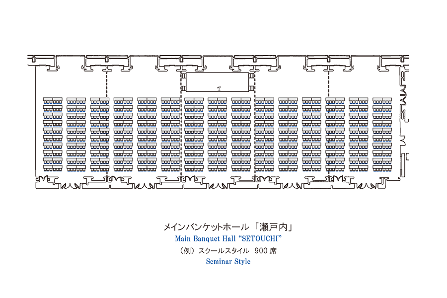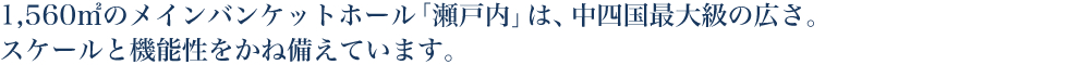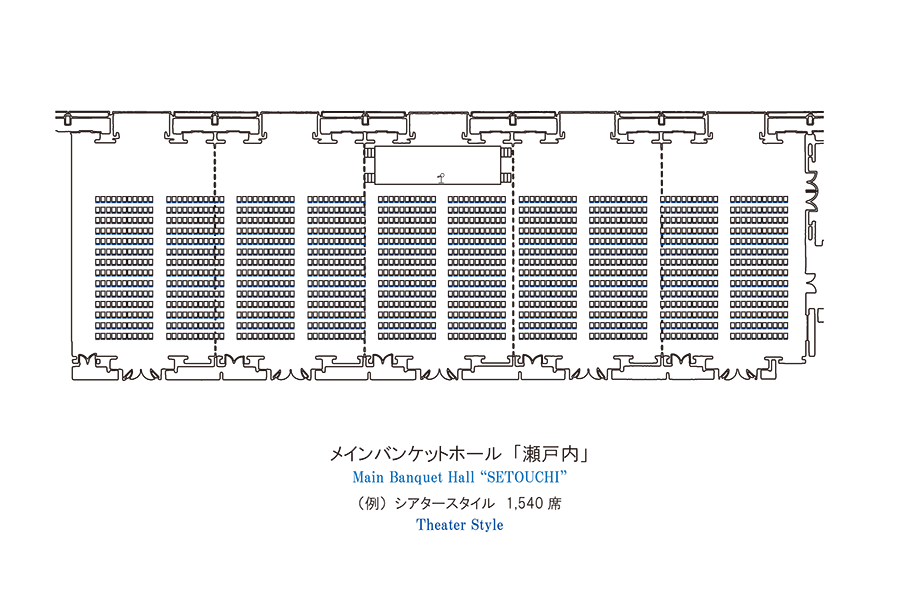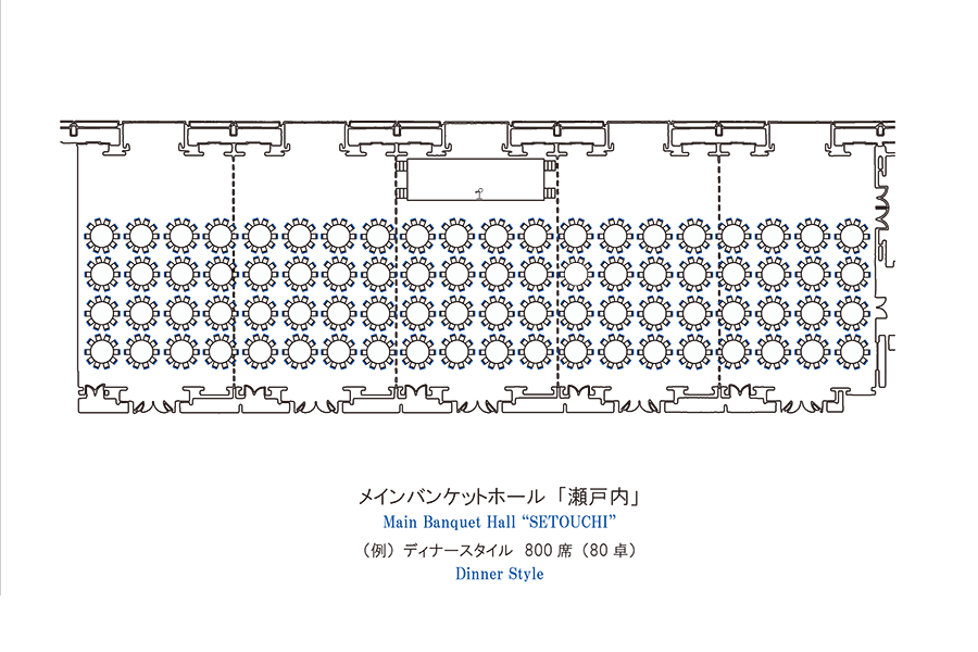 2,000名さままでご利用になれるメインバンケットホール「瀬戸内」は、最大5分割までの会場設定が可能な広さ。