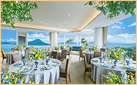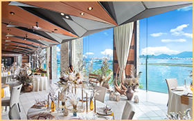 200名さままでご利用になれるバンケットルーム「スイート デ フルール」と屋外テラスは、リゾート感あふれる開放的な空間です。お客さまのご要望に応じて、お好みのスタイルでゲストをお迎えください。