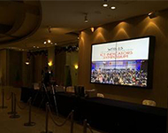 ホテル1Fロビーにデジタルサイネージ(60インチ4面マルチスクリーン)を設置。受付カウンターのイメージバックパネルや、スケジュールや会場などのインフォメーション配信など、多くのお客さまへのご案内に最適です。