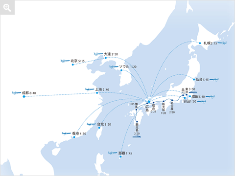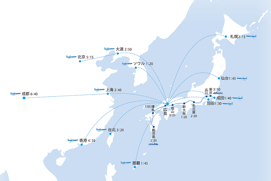 飛行機を利用すると、東京-広島間は約1時間30分。