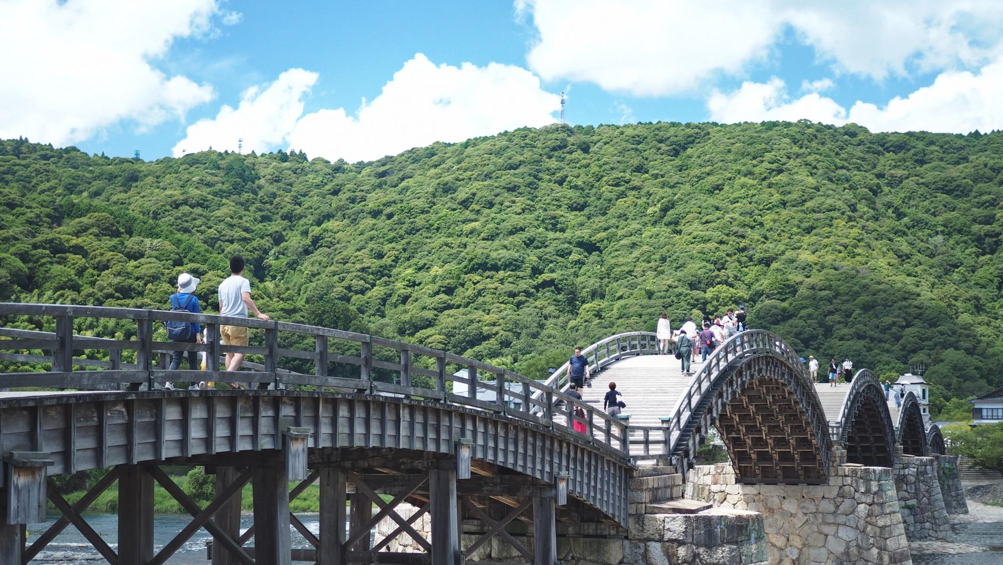 山口県の錦帯橋に到着。柔らかなアーチが美しい、日本を代表する木造橋のひとつです。