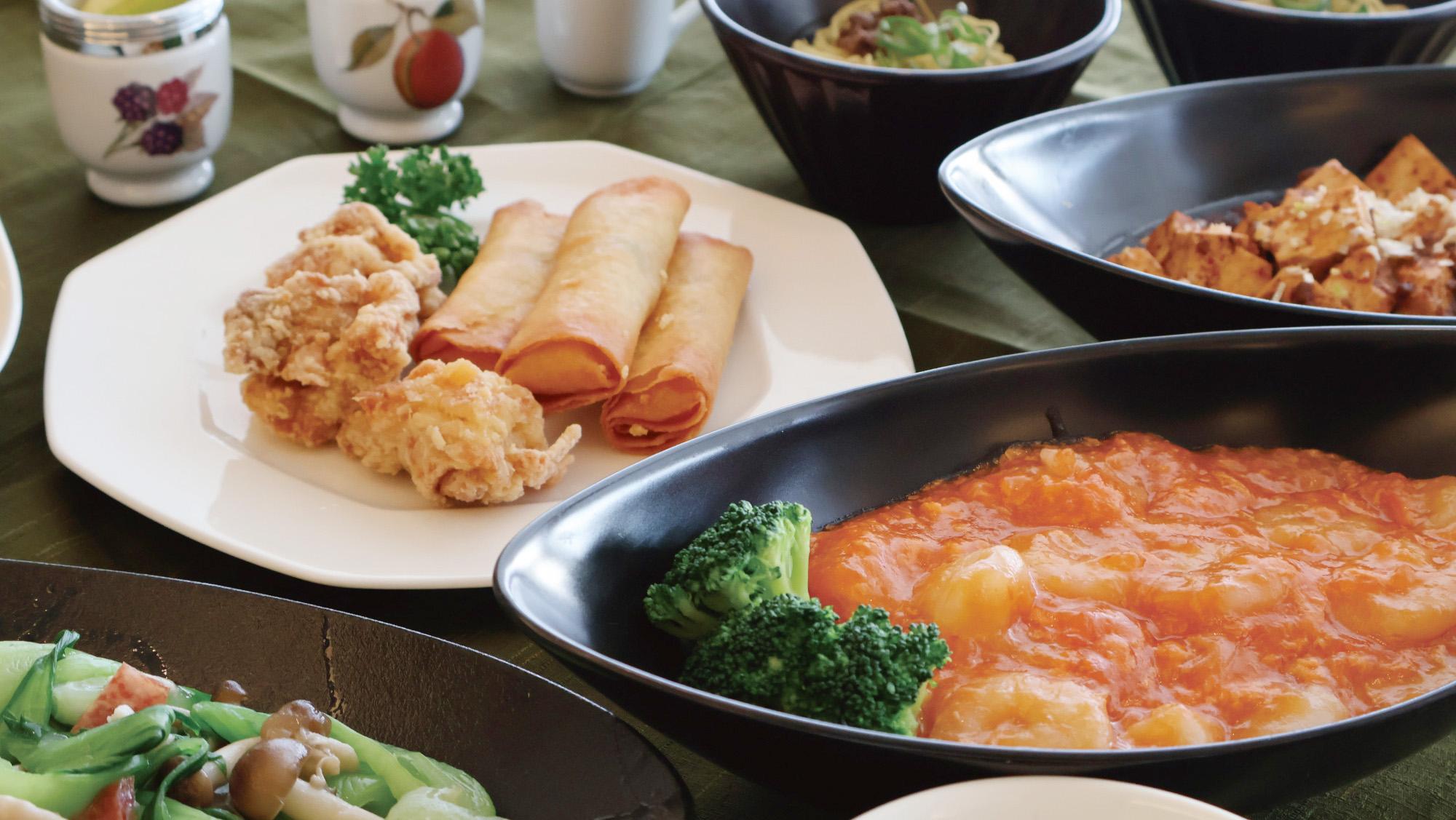 海老のチリソース煮や点心、チャーハン、杏仁豆腐などのデザートまで、王道中国料理が食べ放題。