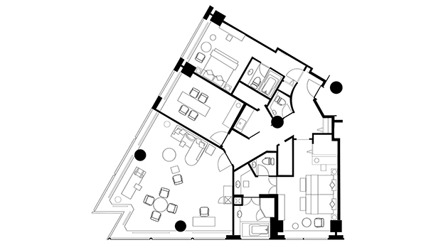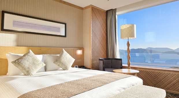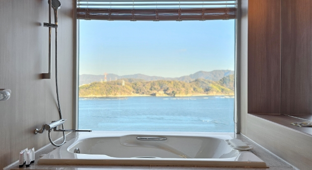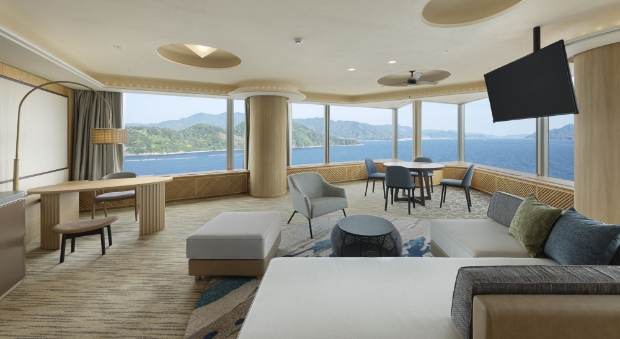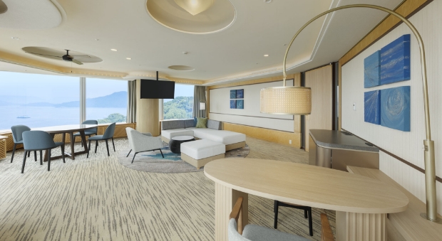きらめく朝日から沈みゆく夕日まで、刻々と表情を変える景色をお楽しみいただける1室限定の最上階客室。