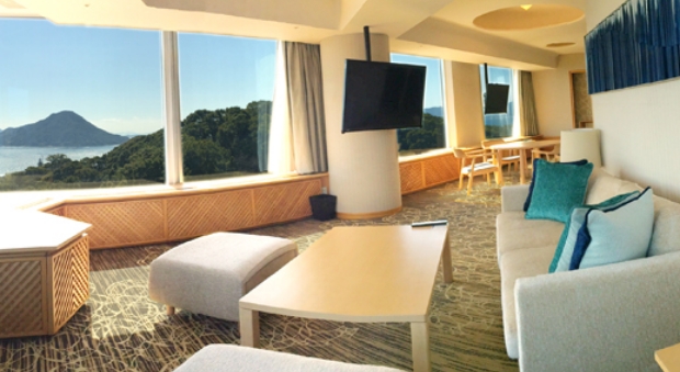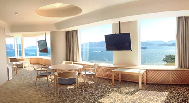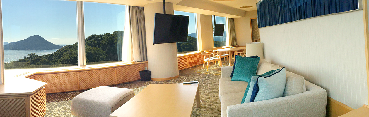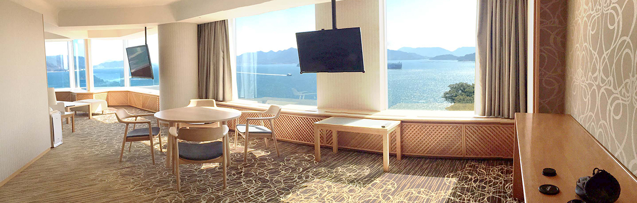 「広島 瀬戸内×至福のハーモニー」。空と海と光が織りなす客室最上階だからこその上質がここに。四季を通じておだやかな瀬戸内海を感じられる、107平米のスイートルーム。
