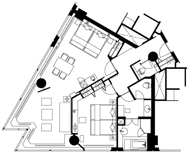 上層階にふさわしい、より一層ラグジュアリーな空間。豪華客船の特別室の雰囲気をアクセントとしたスイートルーム。