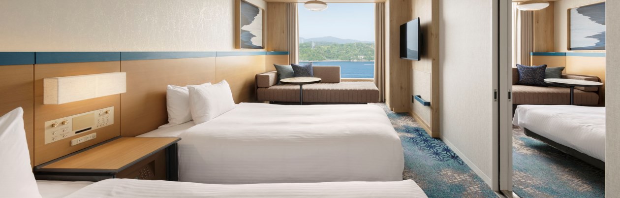 ファミリーやグループにおすすめの、ツイン2室がつながったコネクティングタイプのお部屋。生まれ変わった瀬戸内リゾートフロアで、リゾートステイケーションをお楽しみください。ソファベッドを2台ご利用いただいて、6名さままでご利用いただけます。