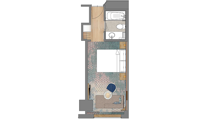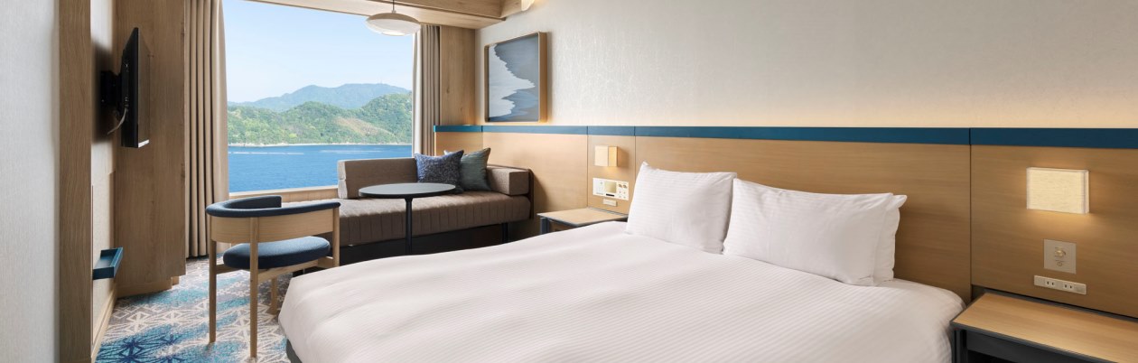 "SETOUCHI WELL-BEING RESORT"をテーマにした、心と身体を癒す寛ぎの空間「瀬戸内リゾートフロア」にある23㎡のキングルーム。木目調の壁や、部屋着として採用した作務衣などで、心も身体も癒される寛ぎの空間を演出します。ソファベッドを1台ご利用いただいて、3名さままでご利用いただけます。