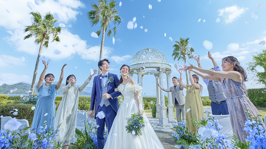 セレモニー後は、ゲストの笑顔に囲まれて幸せのおすそわけとして、ブーケトスやバルーンリリースを。