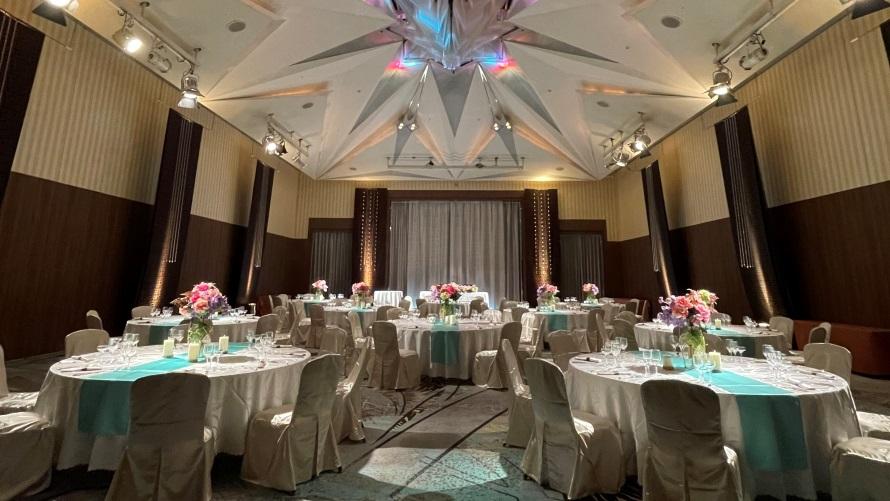 メインテーブルの後ろに広がる瀬戸内海と高い天井が印象的なメインバンケットホール「瀬戸内」