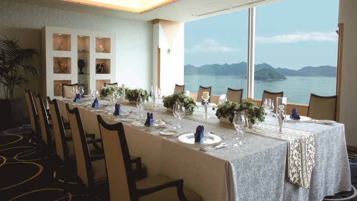 島の邸宅がテーマの白を基調としたクラシックで上品な22F「アイランドビュー ウエスト」は高層階のレストラン個室。瀬戸内海の島々が彩る窓からの絶景はゲストの心を潤します。