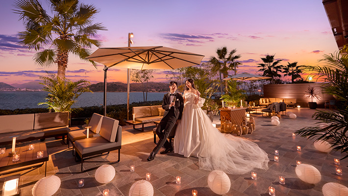 オープンテラスでは、例えば波の音を聞きながらのデザートブッフェなど、使い方はおふたり次第。