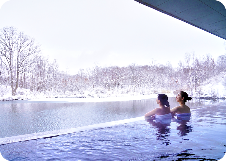 ホテル敷地内の源泉から届くお湯はアルカリ性で疲労回復、神経痛、筋肉痛に効果があると言われています。 柔らかな無色透明のお湯はお肌によく、余分な油を落とし、古い角質をとる「乳化作用」があると言われ、露天風呂から見える池の向こうに雪が積もる冬景色は幻想的でとても美しいです。