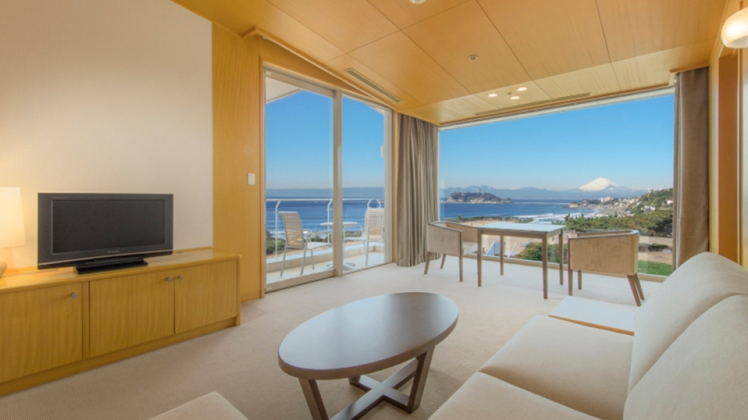 全室オーシャンビューのお部屋は、壮麗な自然の景色を望むことができる絶好のロケーションで、さらに、窓からは相模湾、江の島、晴れた日には富士山や伊豆大島を見ることができ、特別な時間を演出してくれます。