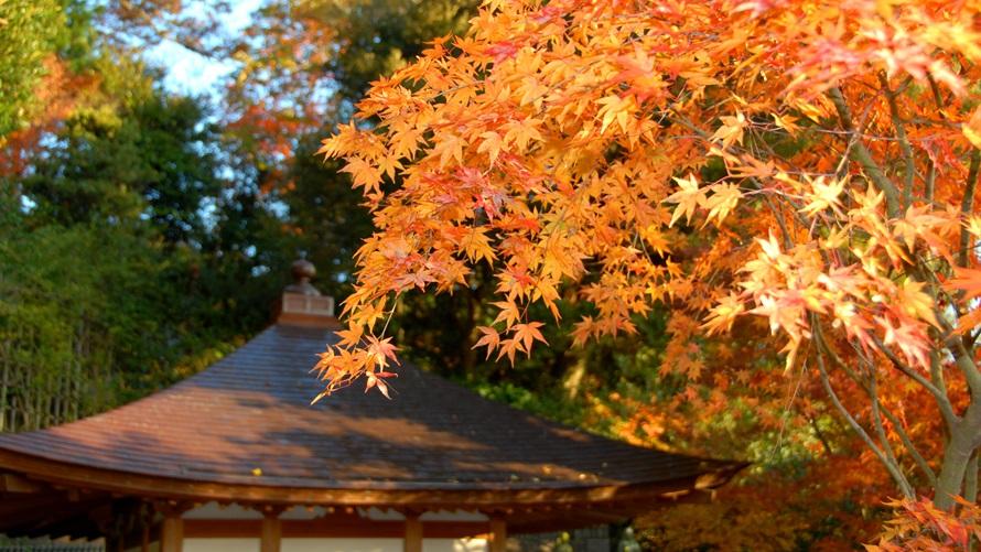 赤く色づいた美しいカエデやイチョウの紅葉を心ゆくまでご覧いただけます。