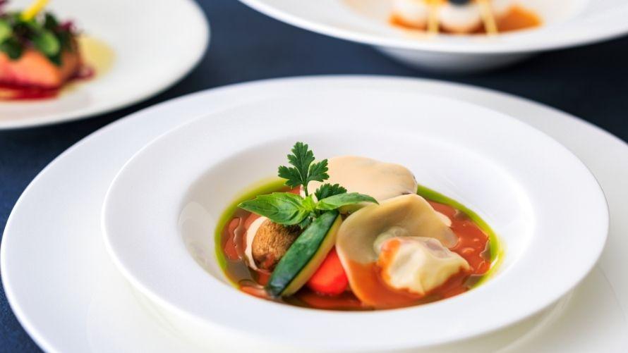 仔牛背肉の軽い煮込みとオマール海老のラヴィオリ バジルの香るアメリカンソース