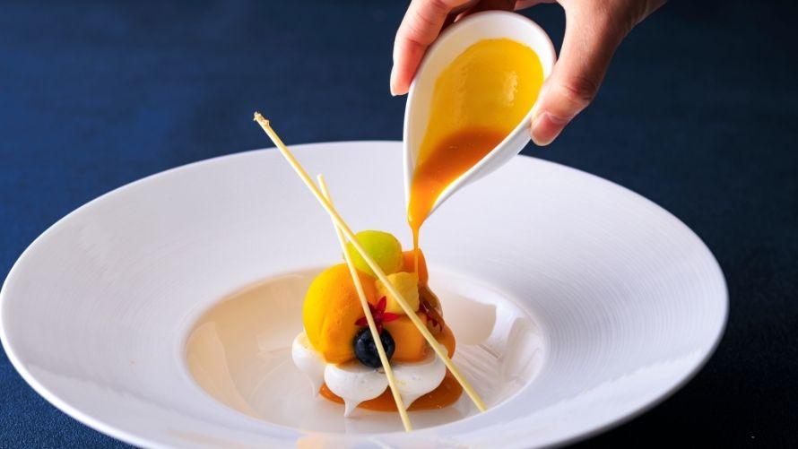 仕上げにマンゴーとパッションフルーツのソースをかけてお召しあがりください。