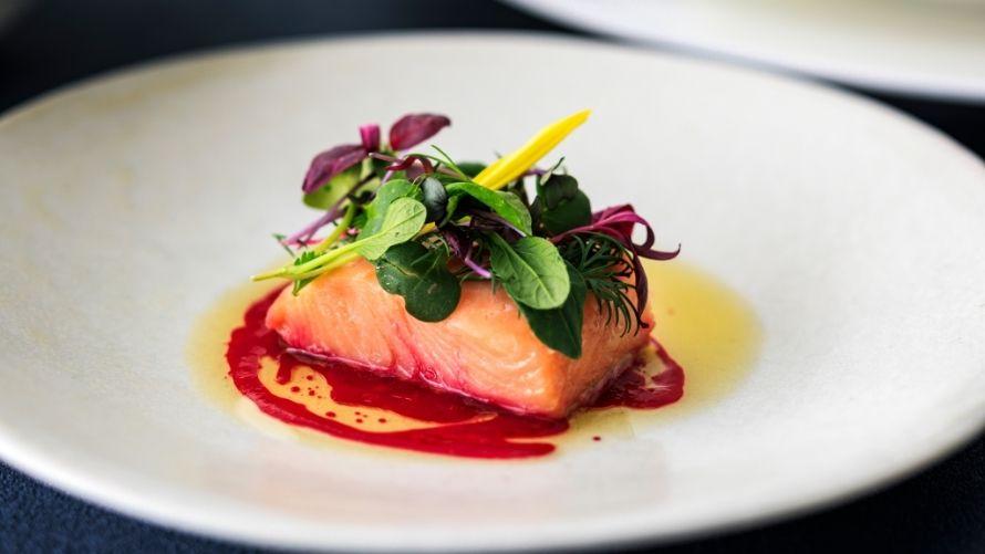 サクラマスのレモンオイルコンフィ エストラゴンの香るビーツのソース