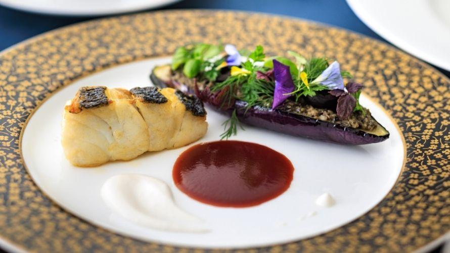 スズキのポワレとアンチョビ風味の茄子 赤ワインのレディクションと昆布風味のクリーム