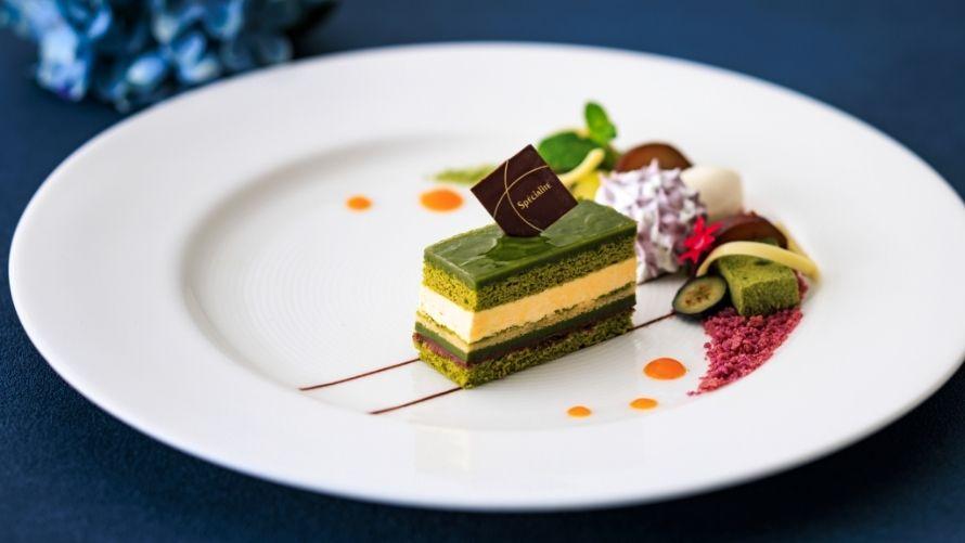 抹茶のコク深いオペラにさわやかなヨーグルトシャーベットを添えた、上品な一皿です。