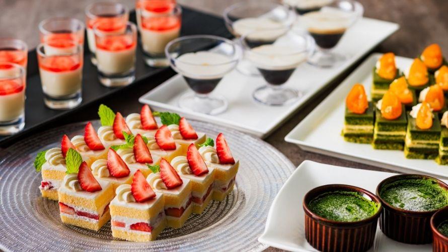 スイーツには、京都 福寿園の抹茶やほうじ茶を使用したコラボレーションデザートなどをご用意しております。