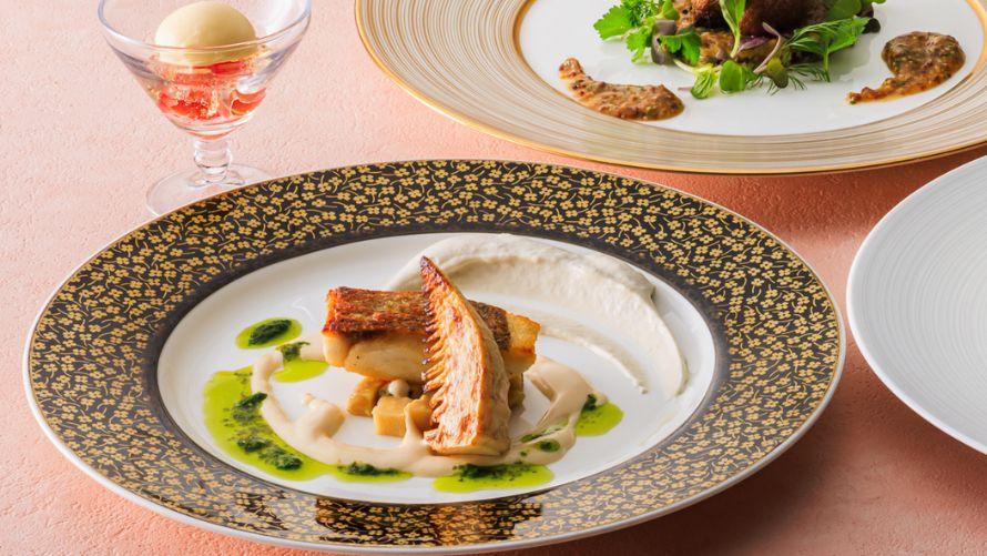 皮目を香ばしく焼き上げた真鯛に、フランスの伝統的な野菜料理「アーティチョークのバリグール」を筍でアレンジしたものを合わせました。
