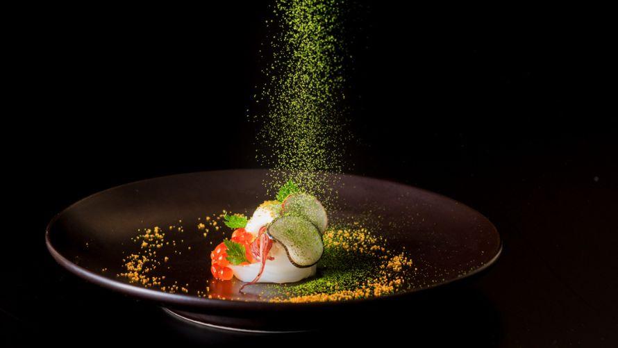 【福寿園の抹茶と烏賊 貝のエキュームにカラスミのアクセント】