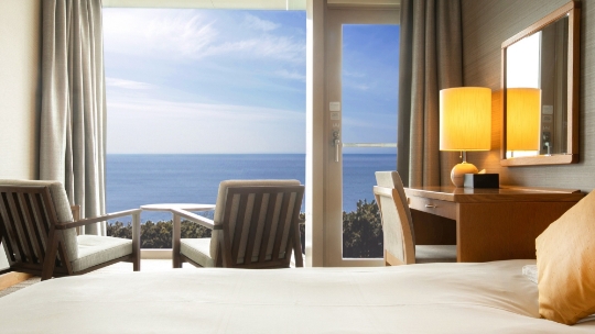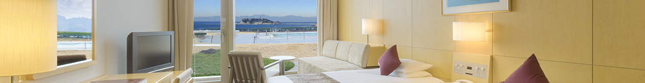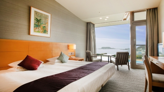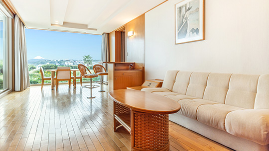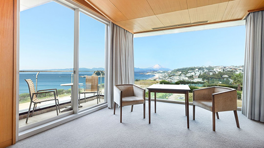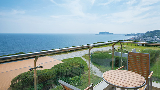 相模湾や江の島の風景が一望できるスイートルーム。バルコニーにあるサマーベッドで心地よい潮風を感じながら、ゆったりと湘南の景色を眺めることができます。