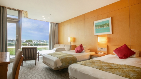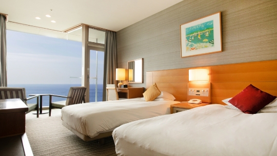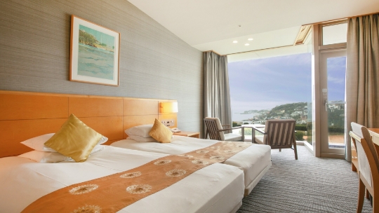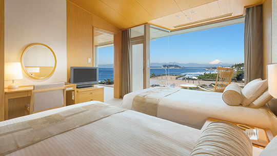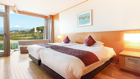 お部屋から江の島や七里ヶ浜ののどかな街並みがご覧いただけます。空気の澄んだ日には、富士山を眺めることができます。110cm幅のベッドを2台合わせたハリウッドスタイルのお部屋です。