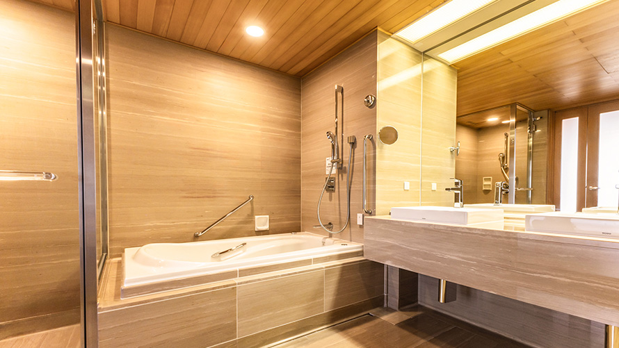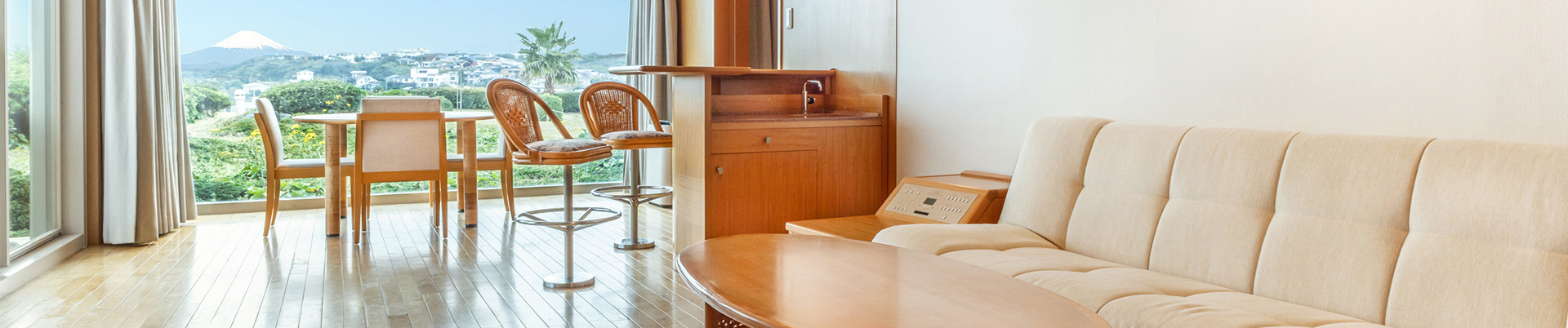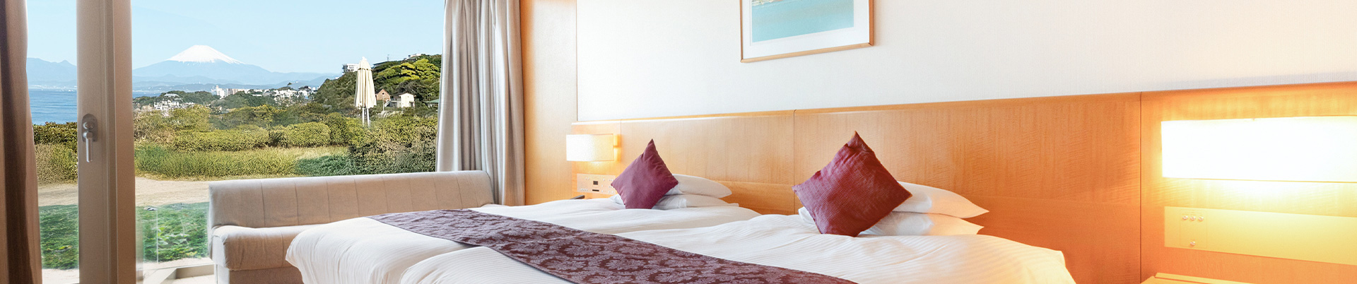 相模湾や江の島の風景が一望できるスイートルーム。バルコニーにあるサマーベッドで心地よい潮風を感じながら、ゆったりと湘南の景色を眺めることができます。