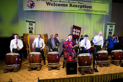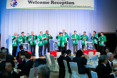 国・地元主催の歓迎夕食会では、日本伝統の鏡割りや真田陣太鼓、善光寺よさこいなど
