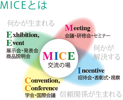 「MICE」とは、Meeting、Incentive、Convention、Exhibition/Eventのイニシャルを組み合わせたビジネスイベントの総称。4つのテーマに基づいて人々の活発な交流の場を創出し、ビジネスの課題を解決しようとする取り組みが広がっています。