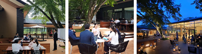 青空の下のテラスで行うオフサイトミーティング、夜はファイヤープレスを囲みながら仲間と語り合う時間。今までにない新たな発想が生まれる、ここでしかできないMICE。開放感に満ちた空間で、新たなリゾートMICEスタイルをご提案します。