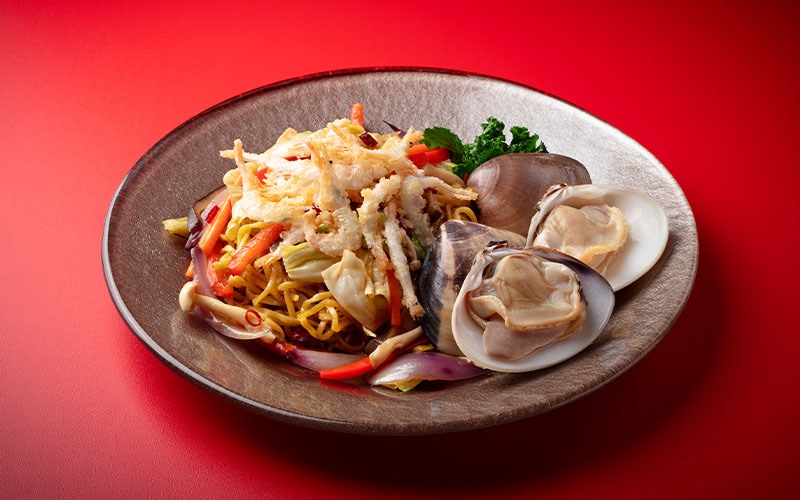 酒蒸しにした大粒の蛤は、ふっくらした食感が身上。蒸し汁は、唐辛子とにんにくがきいた醤油ソースに。揚げた白海老の香ばしさを鼻先に感じつつ、蛤特有の旨味を余さず召しあがれ。