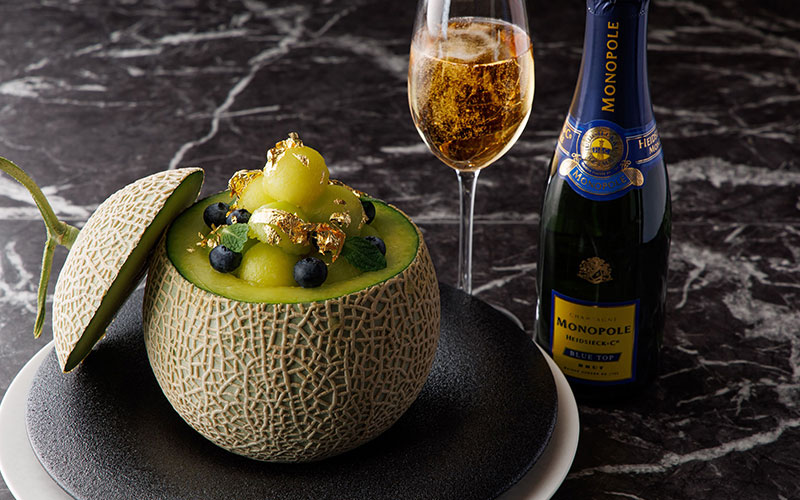 メロン+シャンパン375ml ¥13,500/メロン+蓼科御泉水サイダー ¥5,000- メロンをまるごと1つ使い、シャンパンやご当地サイダーを注いで作る おとなのクリームソーダをご用意いたしました。 高さ9mのパノラマウィンドウから望む雄大な浅間山とともにお楽しみください。