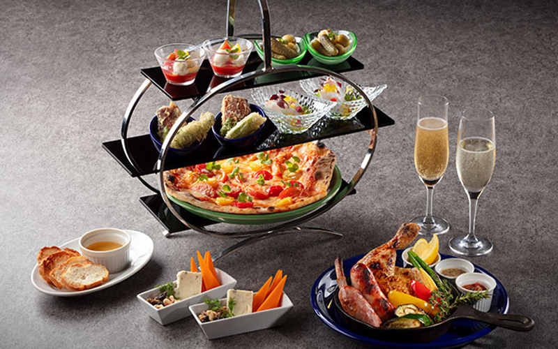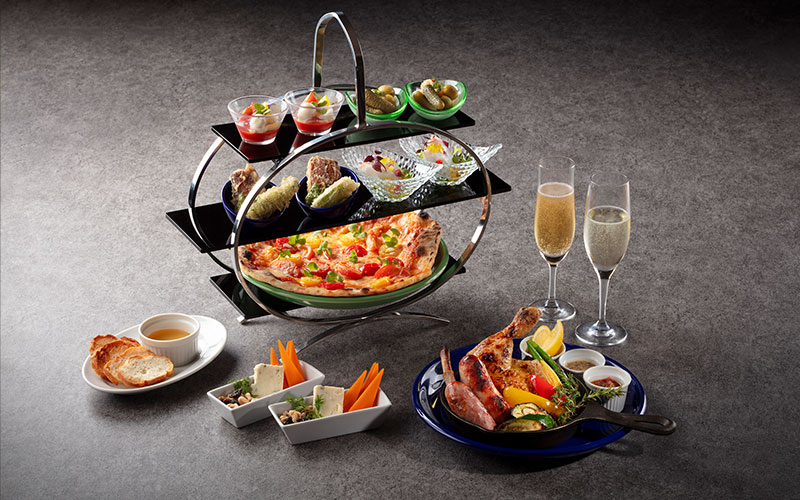 2名さま ¥12,000(セイボリー&ドリンク4杯)- 太陽の余韻を感じる夏の夕暮れにぴったりのハイティーセット。いずれもお酒に合う小皿料理が、ゆったりとした時間に寄り添います。