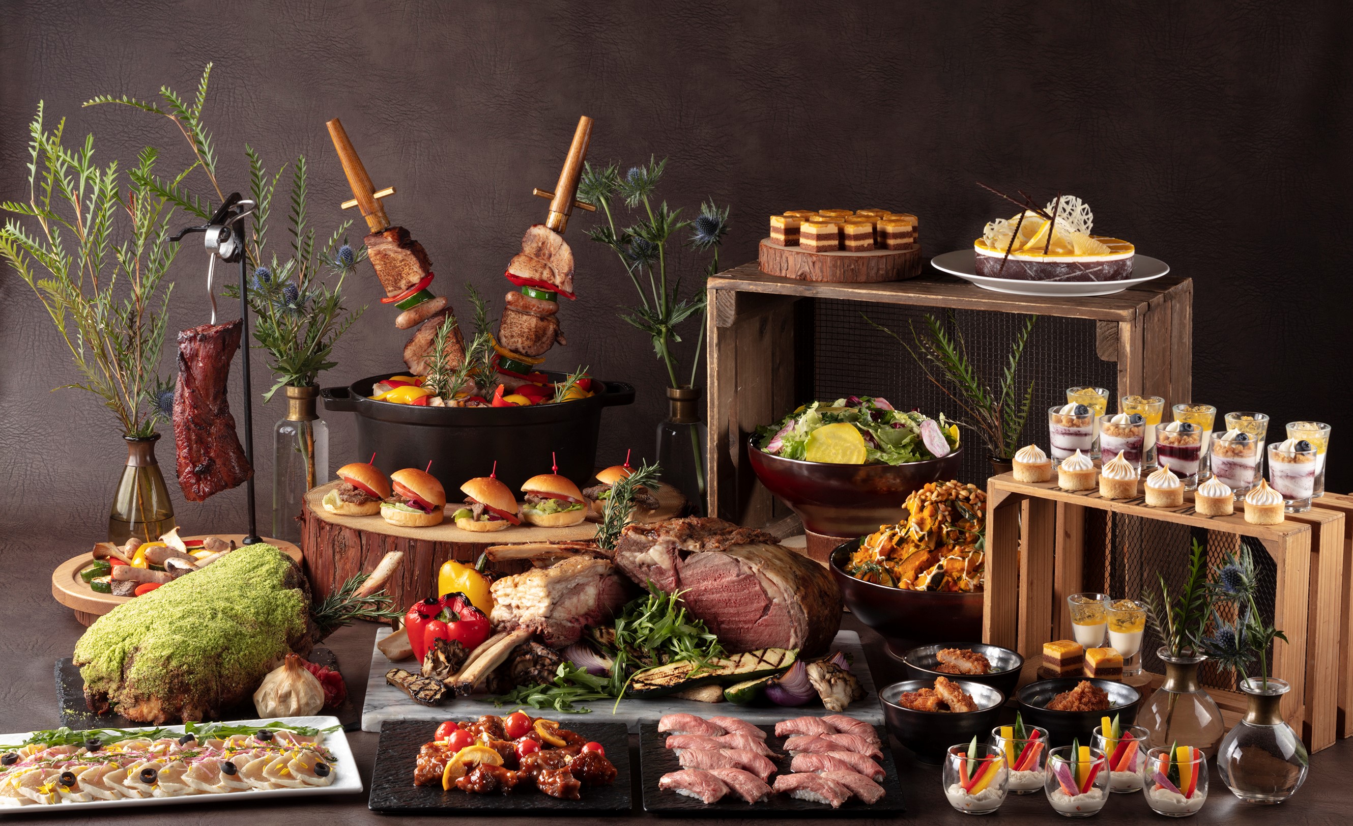 「ローストビーフ」、「ラムレッグの香草パン粉焼き」、「切りたて生ハム」などのダイナミックな肉料理と「牛肉寿司」、「酢豚」、「焼き肉バーガー」など和洋中さまざまに趣向を凝らした肉料理が並びます。 - ※ランチとディナーのメニューは異なります。
