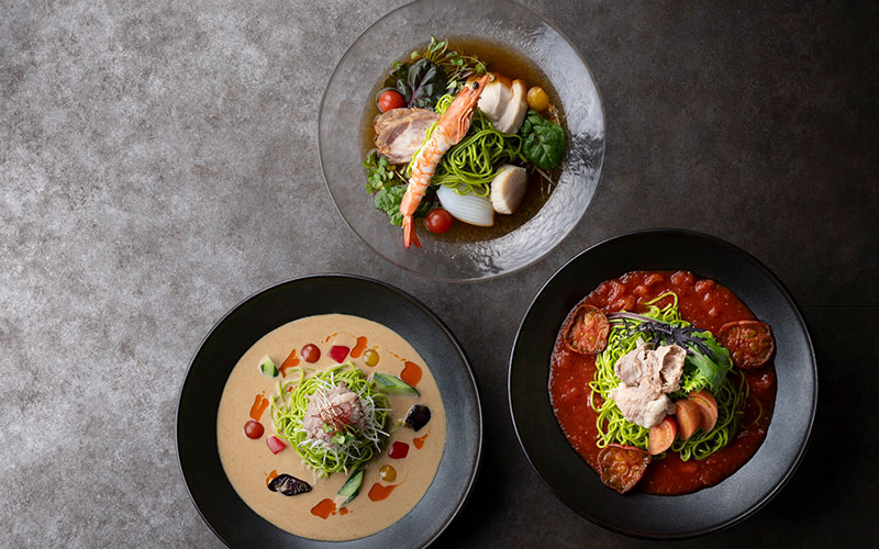 | 人気の冷し担々麺は、豆乳スープで軽やかに仕上げています。色とりどりの野菜がアクセントに。 | ||