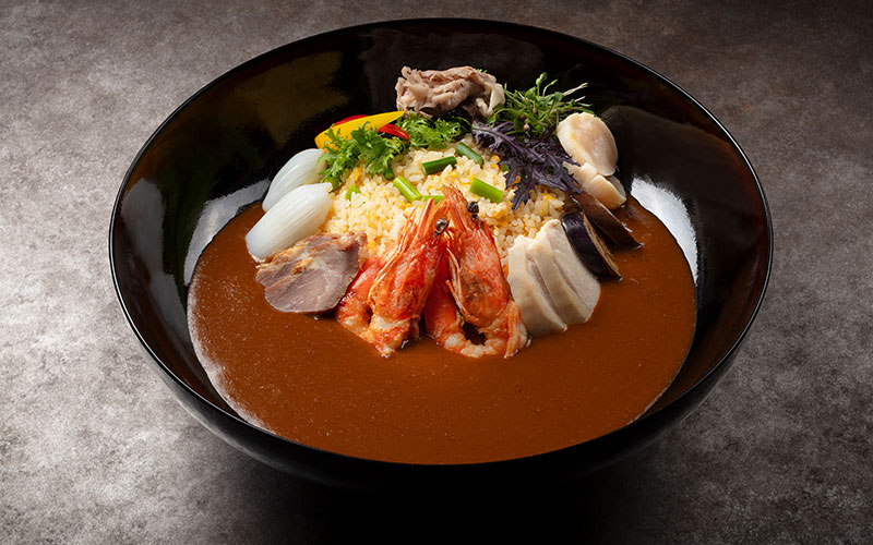 にんにくの芽が入ったガーリック炒飯に、ナムプリックパオやレッドカレー、鶏ガラスープをベースにした中華風カレーソースを合わせて。有頭海老、牛フィレ肉、アスパラガスなど魚介、肉、野菜がたっぷり添えられた、ごちそうカレーです。2名さまでシェアしてお召しあがりいただけます。