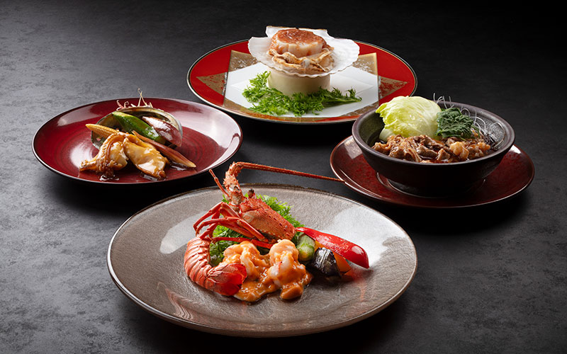 メインは雲丹ソースをまとわせた伊勢海老の衣揚げ。塩味のスープでのばした梅肉ソース和えの帆立貝柱、国産牛の四川風辛味煮、鮑のカキソース炒め、ふかひれの煮込みと、過去の「桃李」レシピ帳を今にアレンジした皿が並びます。前菜、麺、デザートがつきます。