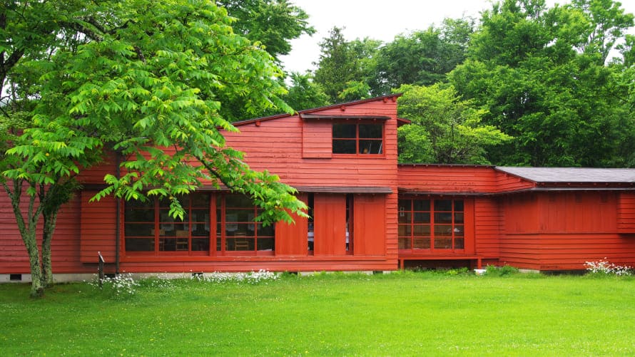 鴨が仲良く泳ぐ塩沢湖を進むと、赤い邸宅が見えてきます。