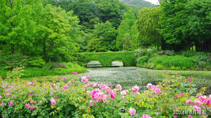 植物に彩られた『軽井沢レイクガーデン』の入り口を抜けると、大きな湖が見えてきます。イングリッシュ・ローズガーデンから遠くの方のめがね橋を臨む景色は、まるでモネの睡蓮の池を思わせるような絵画の世界です。