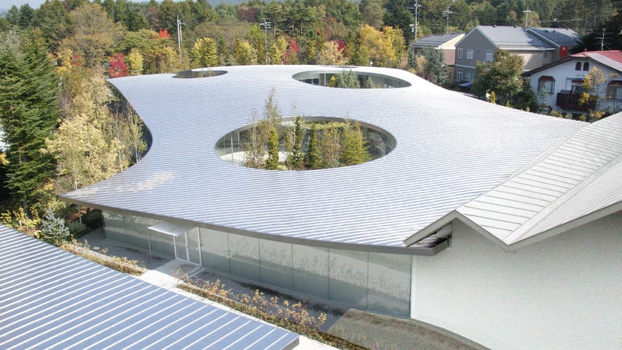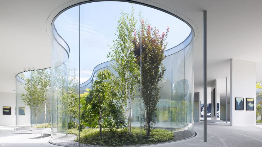 『軽井沢千住博美術館』には、日本画家・千住博(せんじゅひろし)氏の作品が展示され、設計は西沢立衛(にしざわりゅうえ)氏が手がけています。館内にはその土地が持つ自然の傾斜が活かされ、大規模なカラーリーフガーデンを持つ、魅力的な美術館です。