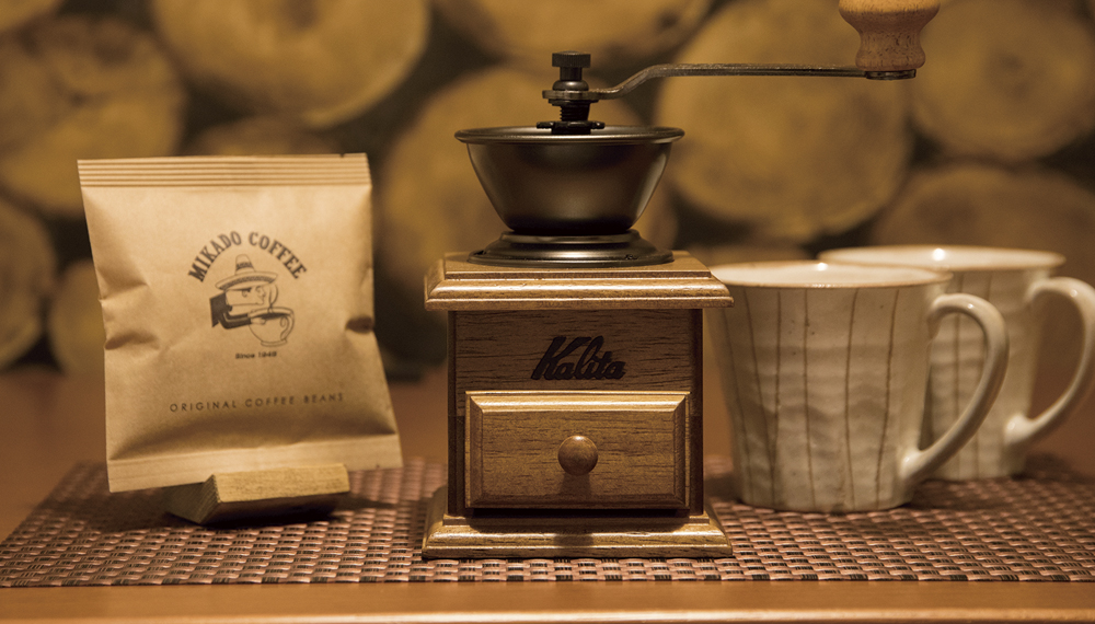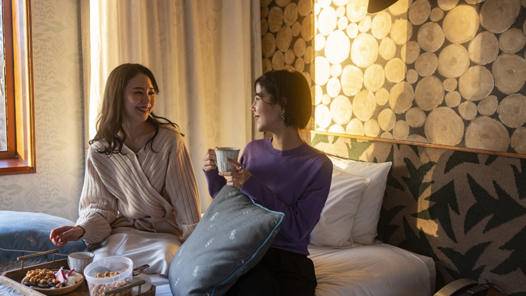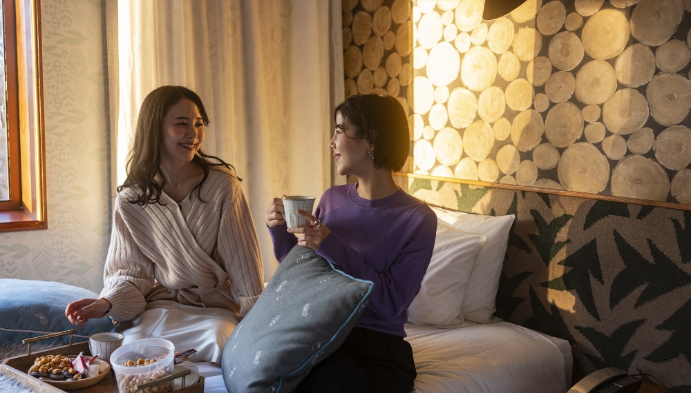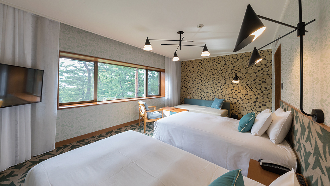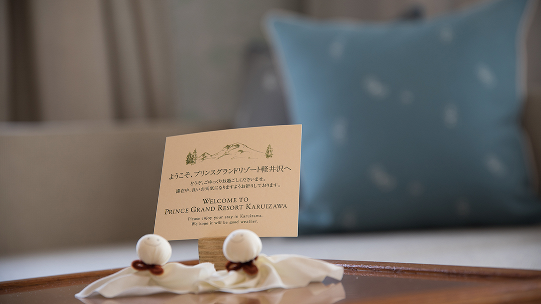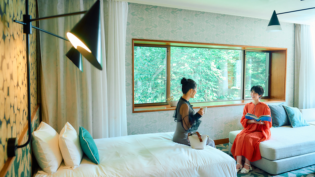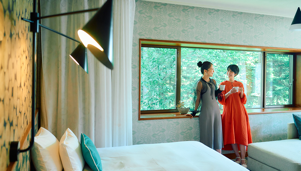 空間デザイナー・橋本夕紀夫氏が採用した「ミナ ペルホネン」のデザインが随所にちりばめられた可愛いお部屋は、丸太や落ち葉、小人の帽子のモチーフなど、まるで絵本の中に入り込んだような癒やしの空間。ホテルの客室には珍しくコーヒーミルがあり、軽井沢のコーヒーを楽しみたい方にも嬉しいポイント。