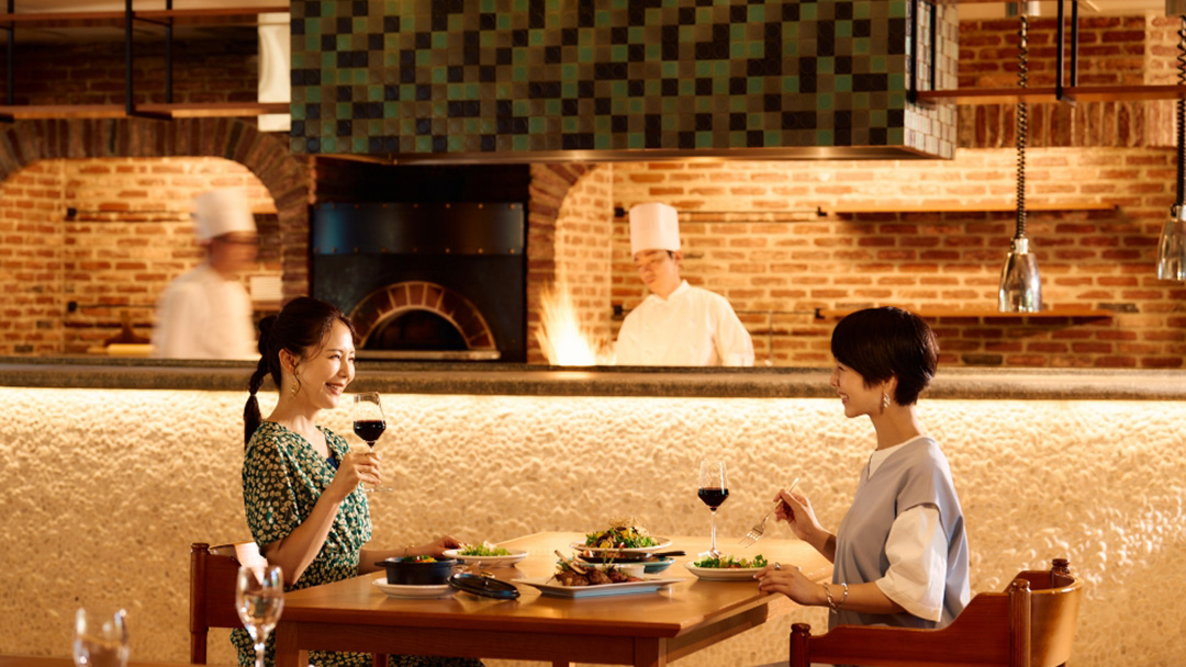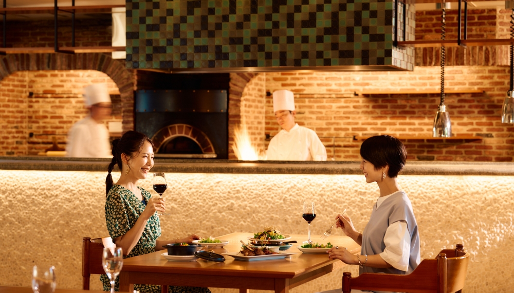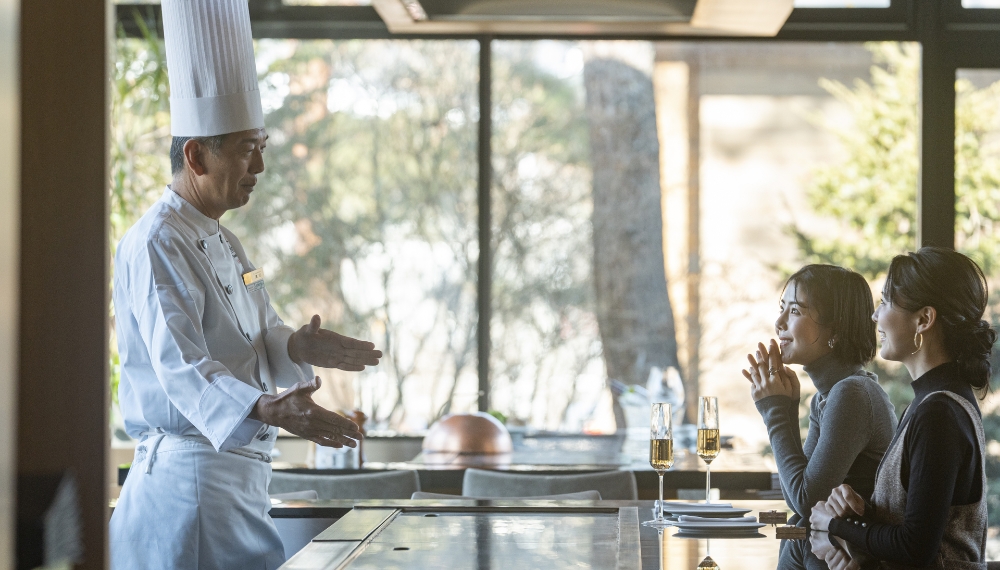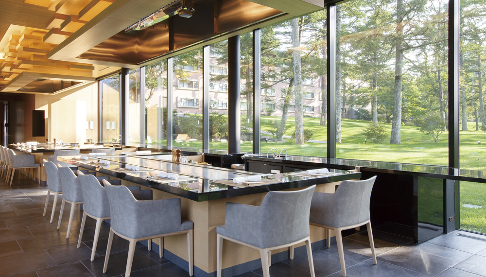 「All Day Dining Karuizawa Grill」でいただけるのは、窯焼きやグリルメニュー。ファッションブランド「ミナ ペルホネン」のテキスタイルデザインやオブジェの装飾が映える空間で、オープンキッチンから繰り広げられるシェフのパフォーマンスが楽しめます。「爽風 鉄板焼 森」では、カウンター席で、移り変わる軽井沢の四季を眺めながら、優雅に鉄板焼コースを味わえます。どちらのレストランも、地元食材にこだわっているのが魅力ポイント。